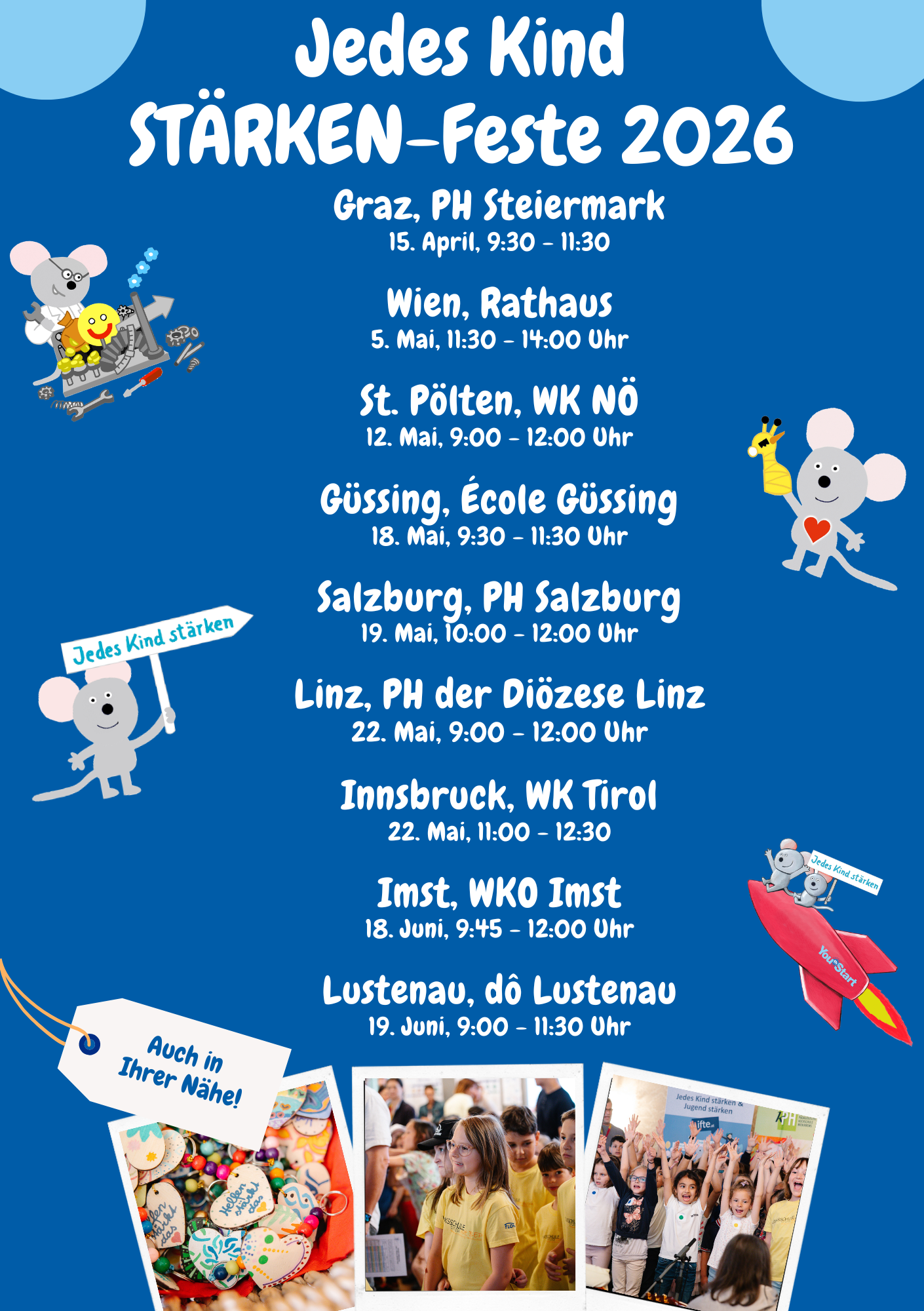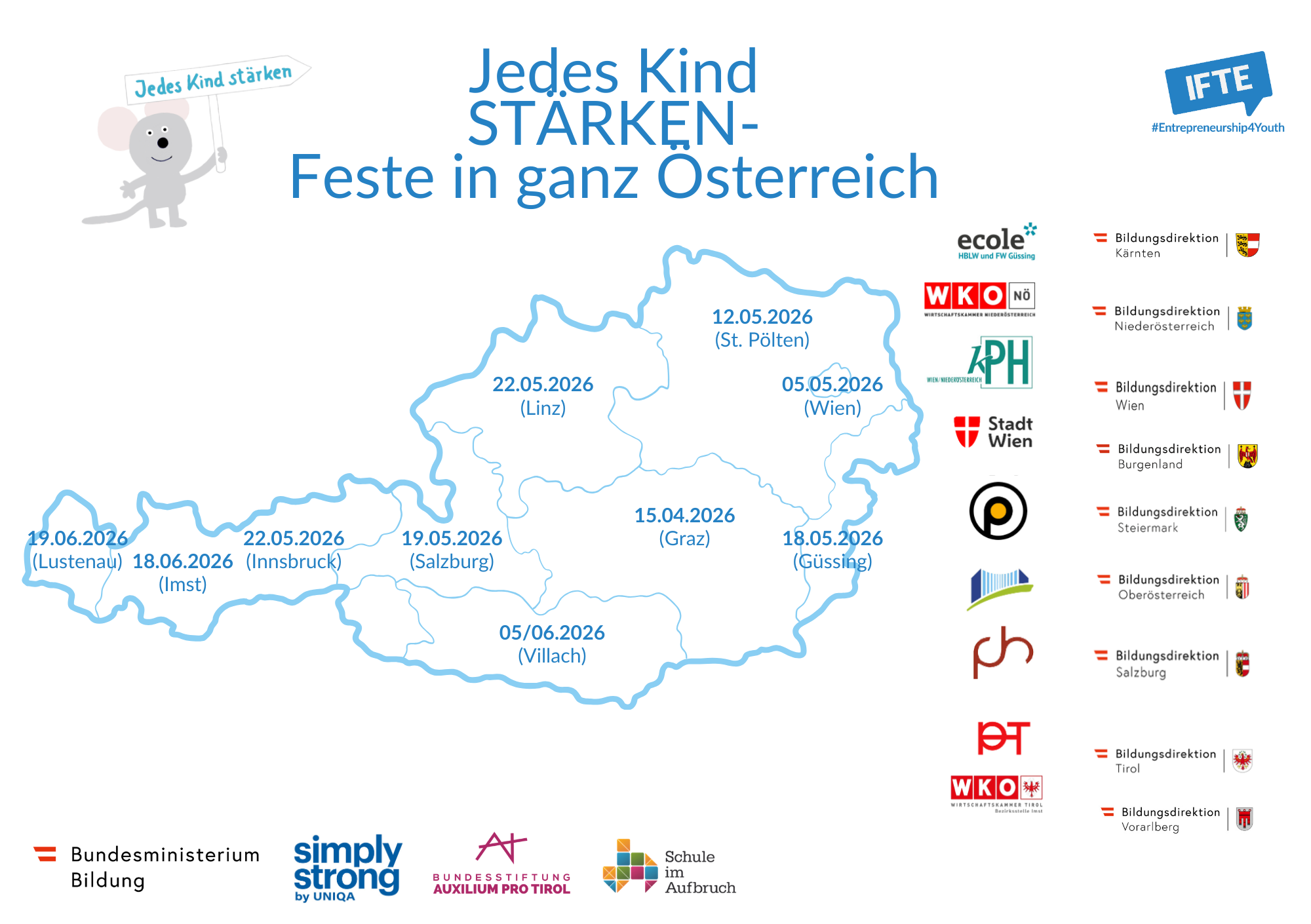Einmal jährlich organisiert die bei IFTE angesiedelte Servicestelle des BMBWF für Jedes Kind stärken & Jugend stärken in Kooperation mit den Bildungsdirektionen und Pädagogischen Hochschulen der Region pro Bundesland ein Stärken-Fest. Schulklassen präsentieren dabei die Ergebnisse der Umsetzung des Programms Jugend stärken.